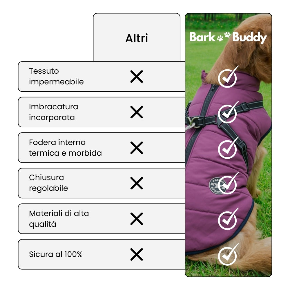 “Perfetta per l’inverno! Tiene il mio cane caldo e asciutto anche sotto la pioggia. Comodissima l’imbracatura integrata.”